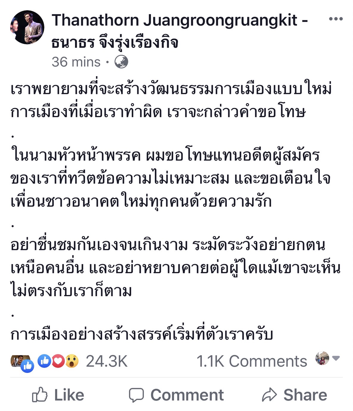 นายธนาธร จึงรุ่งเรืองกิจ หัวหน้าพรรคอนาคตใหม่ โพสต์ข้อความผ่าน เฟซบุ๊ก Thanatorn Juanrungruangkit-ธนาธร จึงรุ่งเรืองกิจ ว่า เราพยายามที่จะสร้างวัฒนธรรมการเมืองแบบใหม่ การเมืองที่เมื่อเราทำผิด เราจะกล่าวคำขอโทษในนามหัวหน้าพรรค ผมขอโทษแทนอดีตผู้สมัครของเราที่ทวีตข้อความไม่เหมาะสม และขอเตือนใจเพื่อนชาวอนาคตใหม่ทุกคนด้วยความรัก อย่าชื่นชมกันเองจนเกินงาม ระมัดระวังอย่ายกตนเหนือคนอื่น และอย่าหยาบคายต่อผู้ใดแม้เขาจะเห็นไม่ตรงกับเราก็ตาม การเมืองอย่างสร้างสรรค์เริ่มที่ตัวเราครับ.-สำนักข่าวไทย