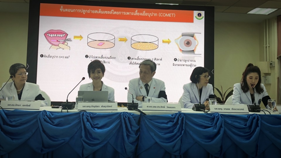 นพ.ประสิทธิ์ วัฒนาภา คณบดีคณะแพทยศาสตร์ศิริราช พร้อมด้วย พญ.งามแข เรืองวรเทย์ หัวหน้าภาควิชาจักษุวิทยา และพญ.ภิญนิดา ตันธุวนิตย์ หัวหน้าสาขากระจกตา แถลงเรื่อง ศิริราชประสบความสำเร็จในการปลูกถ่ายสเต็มเซลล์รักษาผิวกระจกตาเป็นครั้งแรกของประเทศไทย