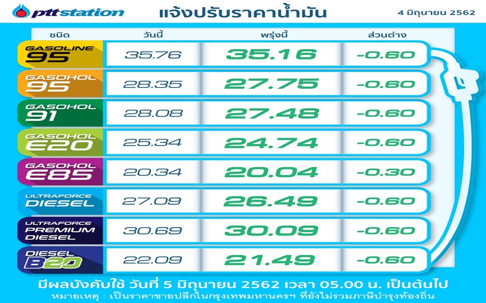 ผู้สื่อข่าวรายงานว่าราคาน้ำมันดิบปรับตัวลดลงอย่างต่อเนื่อง หลังนักลงทุนยังคงกังวลเกี่ยวกับสถานการณ์สงครามการค้าของสหรัฐและจีนที่ยังยืดเยื้อ ซึ่งส่งผลทำให้ความต้องการใช้น้ำมันชะลอตัวลงตามการเติบโตของเศรษฐกิจโลก ส่งผลให้ราคาน้ำมันสำเร็จรูปในไทยปรับลดลงในช่วง 2 วันนี้ หรือตั้งแต่วันที่ 24 พฤษภาคมลดลงรวม 4 ครั้ง โดยกลุ่มเบนซินและแก๊สโซฮอล์ ลดลง 1.80 บาท/ลิตร และกลุ่มดีเซลลดลง 1.70 บาทต่อลิตร