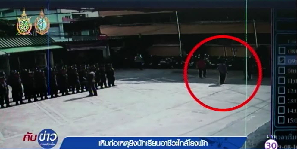 สมุทรปราการ 19 ส.ค.-นักเรียนช่างกล ถูกลูกตำรวจเก่าขี่รถจักรยานยนต์มาจอดชักปืนกระหน่ำยิงหมดโม่ กระสุนเข้าเหยื่อ 2 นัด หนีตายเข้าใต้ถุนศาลาประชาคม ส่วนผู้ก่อเหตุถูกล็อคตัวทันควัน