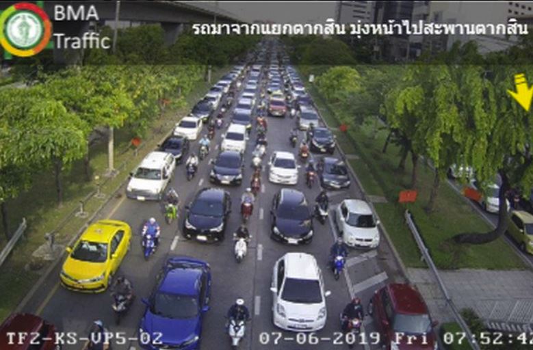 ทางพิเศษศรีรัช จากงามวงศ์วาน มุ่งหน้าประชาชื่น-ลงพระราม6 (คลองประปา)-เข้าต่างระดับพญาไท ลงยมราช-พระราม4 (หัวลำโพง)-ลงถนนสีลม ติดขัดมาก ท้ายสะสมเหนือถนนงามวงศ์วาน