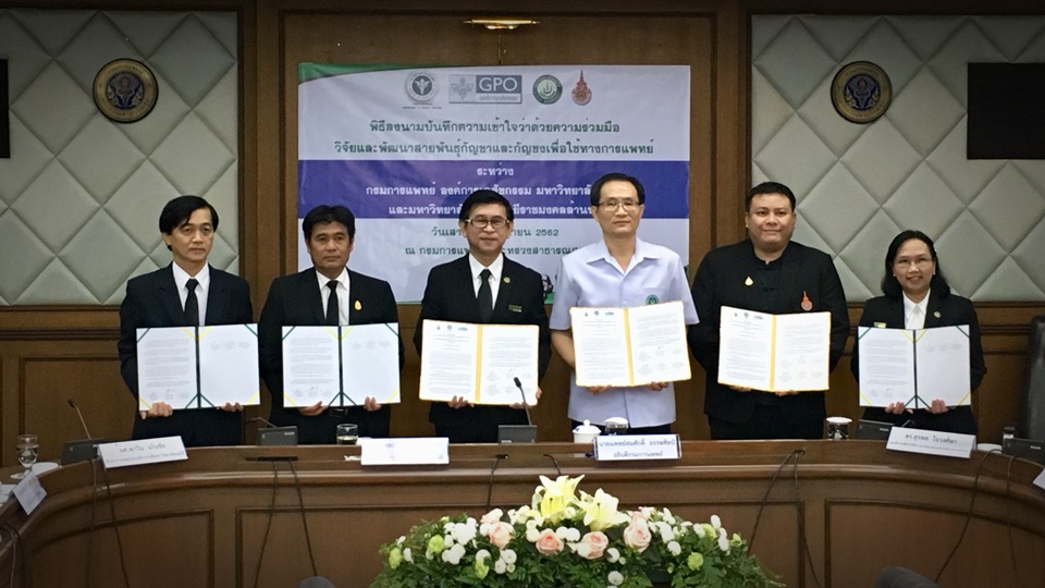 นพ.สมศักดิ์ อรรฆศิลป์ อธิบดีกรมการแพทย์ นพ.วิฑูรย์ ด่านวิบูลย์ ผู้อำนวยการองค์การเภสัชกรรม พร้อมด้วย นายพาวิน มโนชัย รักษาการแทนรองอธิการบดีมหาวิทยาลัยแม่โจ้ และ นายสุรพล ใจวงศ์ษา รองอธิการบดีมหาวิทยาลัยเทคโนโลยีราชมงคลล้านนา ร่วมลงนามบันทึกความเข้าใจว่าด้วยความร่วมมือวิจัยและพัฒนาสายพันธุ์กัญชาและกัญชงเพื่อใช้ทางการแพทย์