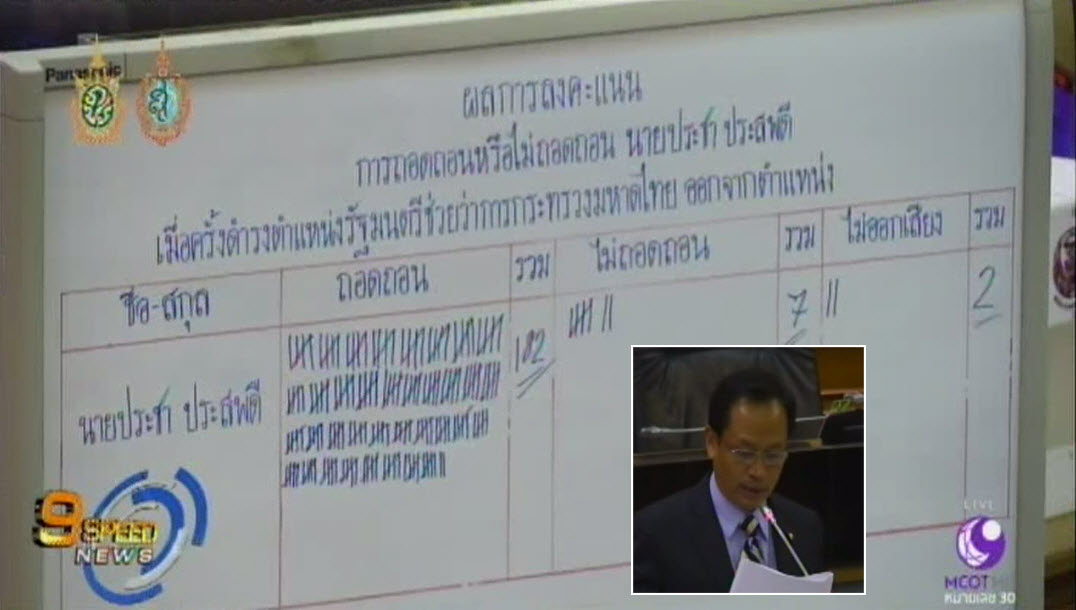 ที่ประชุมสภานิติบัญญัติแห่งชาติ (สนช.) วันนี้ มีมติถอดถอนนายประชา ประสพดี ออกจากตำแหน่ง รมช.มหาดไทย กรณีแทรกแซงการทำงานของบอร์ดองค์การตลาด เพื่อช่วยเหลือคดีทุจริตให้นายธีธัช สุขสะอาด อดีตผู้อำนวยการองค์การตลาด ด้วยคะแนน 182 ต่อ 7 เสียง งดออกเสียง 2 เสียง ซึ่งแม้ว่านายประชา จะไม่ได้ดำรงตำแหน่งรัฐมนตรีแล้ว ก็ส่งผลให้ต้องถูกตัดสิทธิ์ทางการเมืองเป็นเวลา 5 ปี