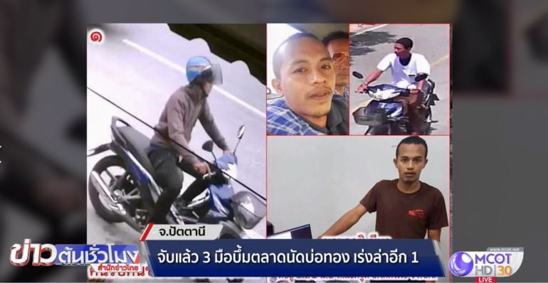 เหตุคนร้ายใช้รถจักรยายนต์ประกอบระเบิดจอดทิ้งไว้ที่ตลาดนัดบ่อทอง อำเภอหนองจิก จังหวัดปัตตานี หวังทำร้ายเจ้าหน้าที่ แต่กลับมีประชาชนถูกลูกหลงเสียชีวิต 2 คน เหตุเกิดวันที่ 27 พฤษภาคมที่ผ่านมา ล่าสุดเจ้าหน้าที่แกะรอยรวบผู้ร่วมก่อเหตุได้แล้ว 3 คน คือคนมารับคนขี่รถจักรยานยนต์ประกอบระเบิด คนกดระเบิด และคนที่มีความเชื่อมโยงกับรถที่ใช้ประกอบระเบิด การสอบปากคำ 2 ใน 3 คน สารภาพ โดยจำนนต่อหลักฐาน แต่อีก 1 คนยังให้การภาคเสธและมีผู้ต้องสงสัยอีก 1 คน ซึ่งทำหน้าที่ขี่รถประกอบระเบิดมาจอดไว้ที่ตลาดนัด เจ้าหน้าที่อยู่ระหว่าง ติดตามตัวมาสอบสวน มั่นใจมีหลักฐานชัดเจนสามารถดำเนินการกับผู้ร่วมก่อเหตุได้ทั้งหมด.-สำนักข่าวไทย