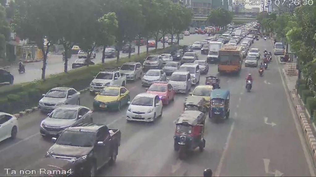 กทม. 11 มิ.ย.-สวพ.FM 91 รายงานจราจรเช้าวันอังคาร ถ.พระราม 4 ขาเข้า มุ่งหน้าแยกวิทยุ รถติดขัดมาก ท้ายแถวยาว