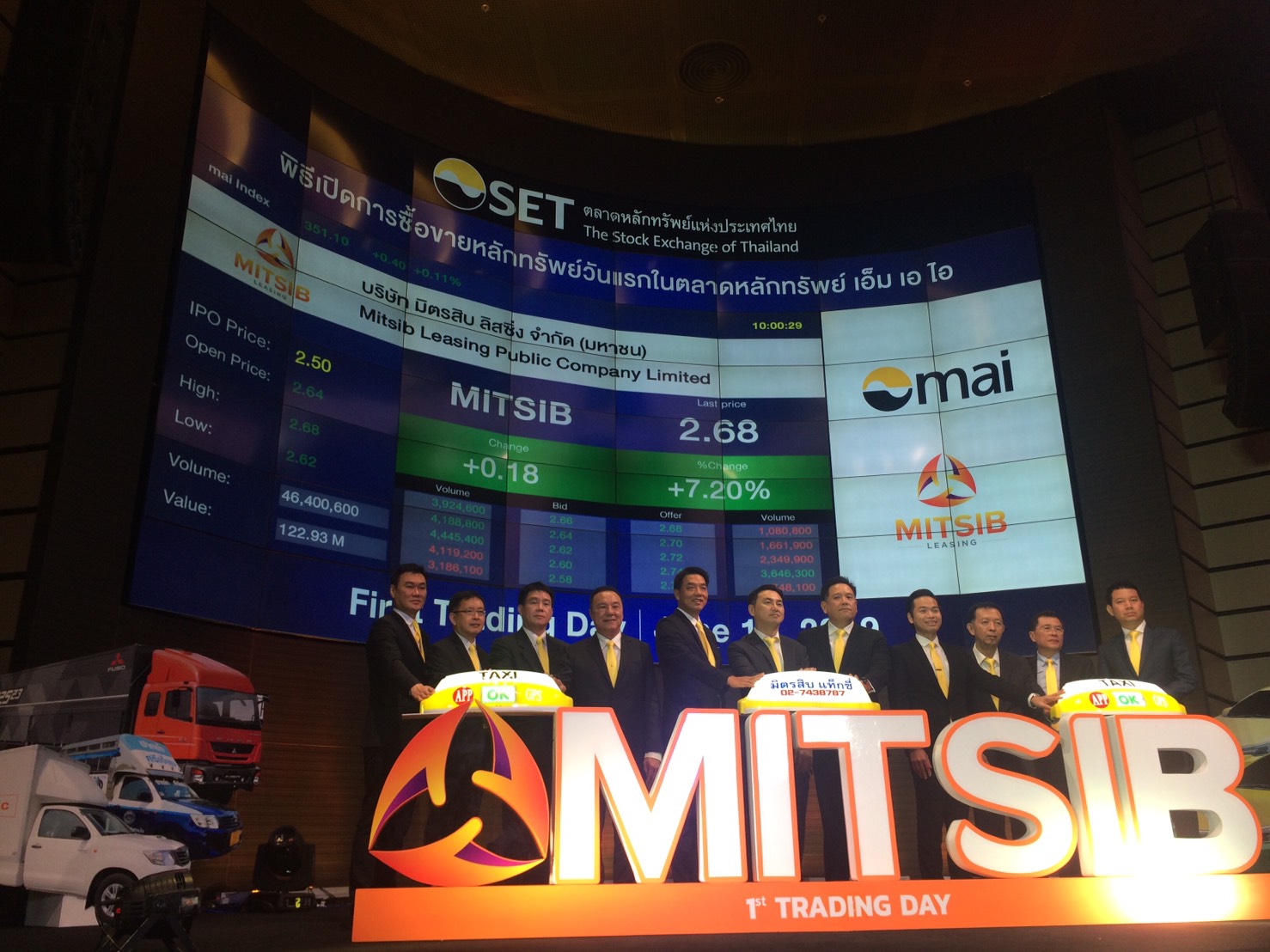 ตลท. 11 มิ.ย. – MITSIB เปิดเทรดวันแรกตลาดเอ็มเอไอ 2.64 บาท เหนือจอง 5.6 % ตั้งเป้าปีนี้ธุรกิจโต 30-35% จากพอร์ตสินเชื่อเช่าซื้อรถแท็กซี่และรถโดยสารสาธารณะ