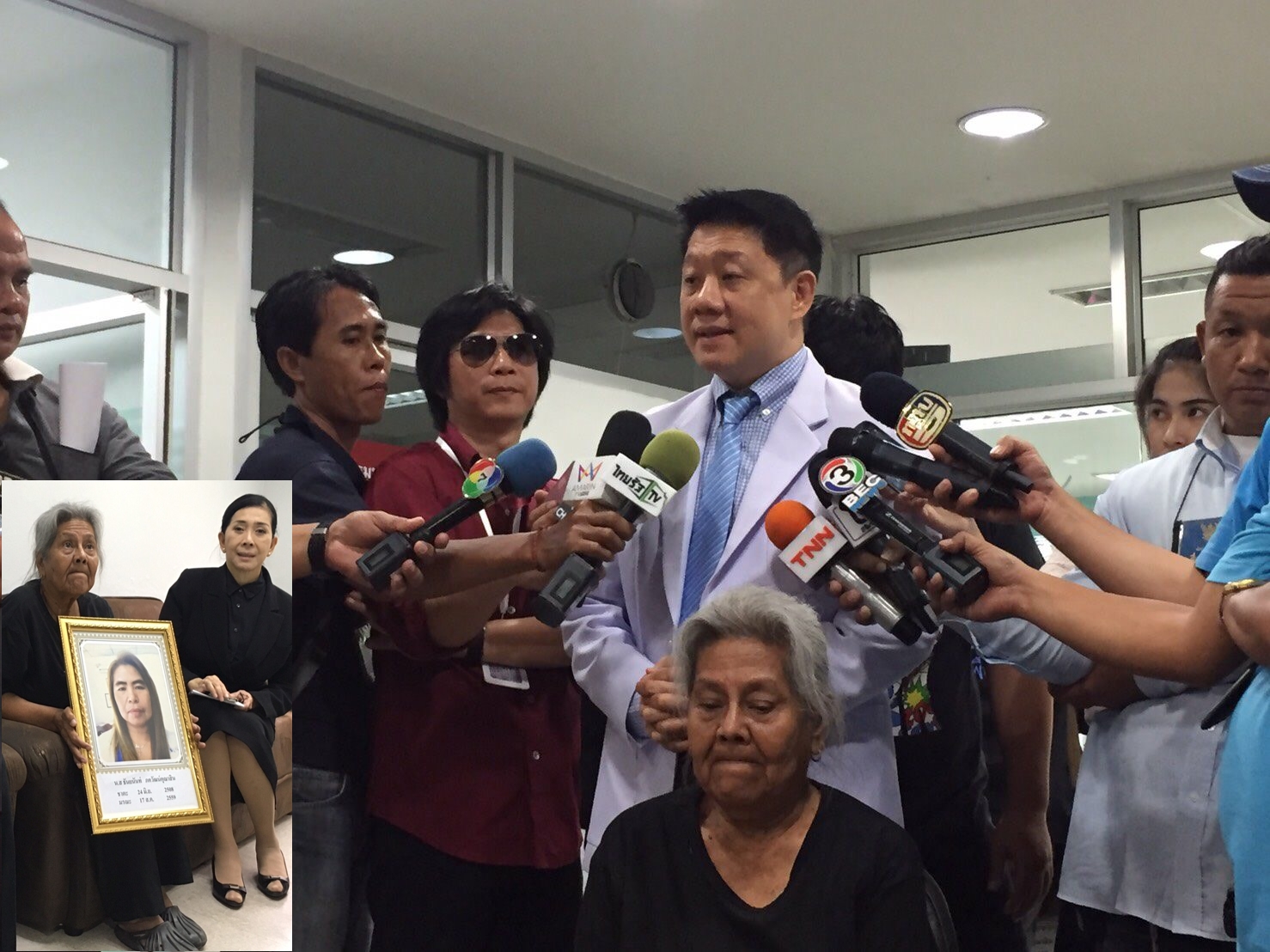 ที่สถาบันนิติเวชวิทยา โรงพยาบาลตำรวจ ประธานมูลนิธิปวีณาหงสกุลเพื่อเด็กและสตรี พร้อมนางอู๊ด จันทร์สูตร มารดานางธันยนันท์ ภควัฒน์คุณาสิน อายุ 51 ปี ที่ถูกสามียศพันตำรวจโท สภ.เมืองสมุทรสาคร ทำร้ายร่างกายจนเสียชีวิต มารับทราบผลชันสูตรศพนางธันยนันท์