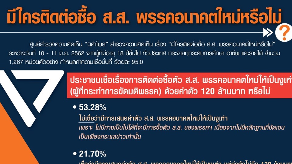 นิด้าโพล 12 มิ.ย.- นิด้าโพล สำรวจความเห็นประชาชน เรื่องมีใครติดต่อซื้อส.ส.พรรคอนาคตใหม่ หรือไม่ พบร้อยละ 53.28 ไม่เชื่อว่ามีการเสนอค่าตัวให้ส.ส. และร้อยละ 77.27 เห็นว่าพรรคควรนำหลักฐานออกมาแสดง เพื่อเอาผิดคนที่มาติดต่อซื้อตัว ส.ส. และดำเนินการตามกฎหมายต่อไป