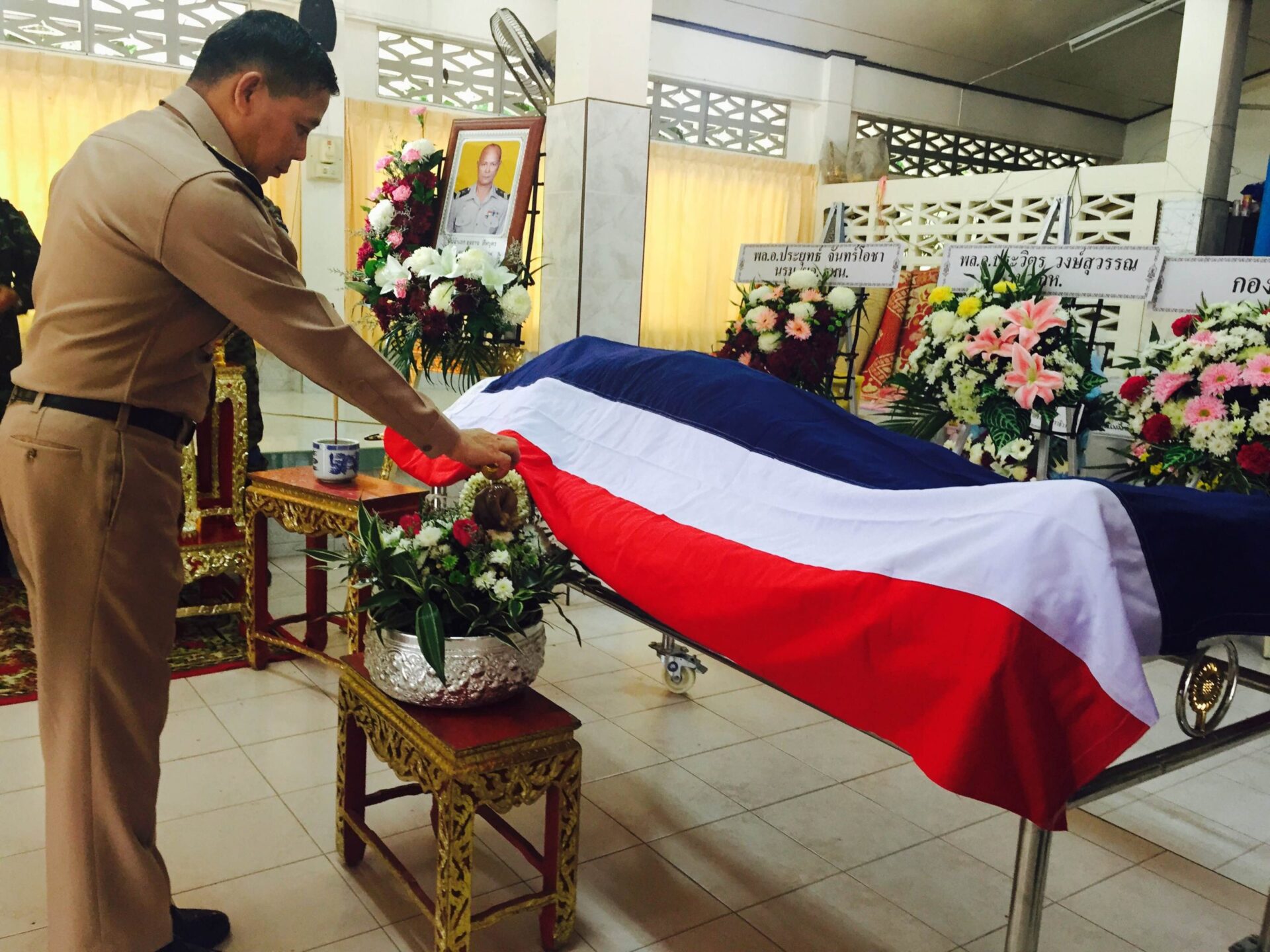 นราธิวาส 19 ส.ค.- ข้าราชการชั้นผู้ใหญ่หลายหน่วยงานร่วมพิธีอาบน้ำศพ-สดุดีเกียรติยศ “พ.จ.อ.องอาจ” เสียชีวิตถูกลอบวางระเบิดขณะปฏิบัติหน้าที่ในนราธิวาส