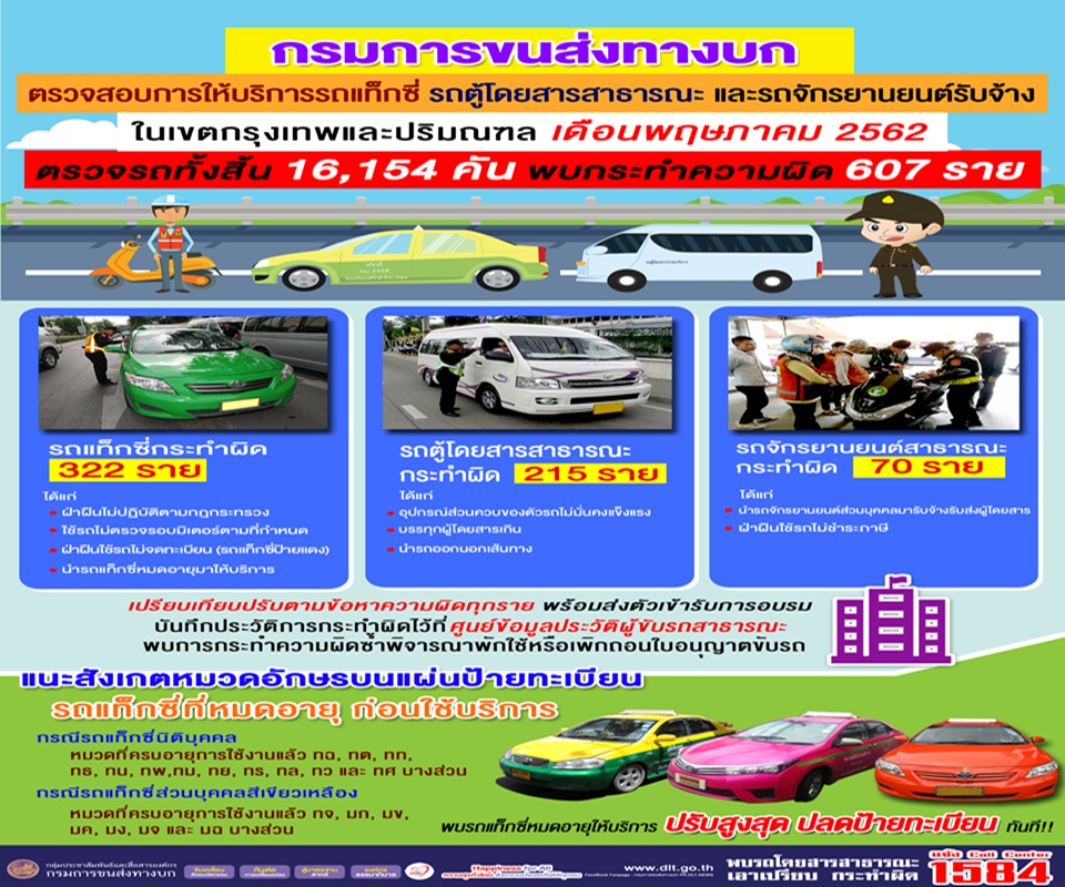 นางจันทิรา บุรุษพัฒน์ รองอธิบดีกรมการขนส่งทางบก เปิดเผยว่า เดือนพฤษภาคม 2562 ดำเนินการตรวจสอบรถแท็กซี่ รถตู้โดยสารสาธารณะ และรถจักรยานยนต์รับจ้าง 16,154 ราย พบกระทำความผิด 607 ราย โดยตรวจสอบการให้บริการรถแท็กซี่ 7,763 ราย พบการกระทำความผิด 322 ราย ความผิดส่วนใหญ่ ได้แก่ ฝ่าฝืนไม่ปฏิบัติตามกฎกระทรวง 135 ราย ใช้รถไม่ตรวจรอบมิเตอร์ตามที่กำหนด 45 ราย ฝ่าฝืนใช้รถไม่จดทะเบียน (รถแท็กซี่ป้ายแดง) 32 ราย นำรถแท็กซี่หมดอายุมาให้บริการ 25 ราย เป็นต้น