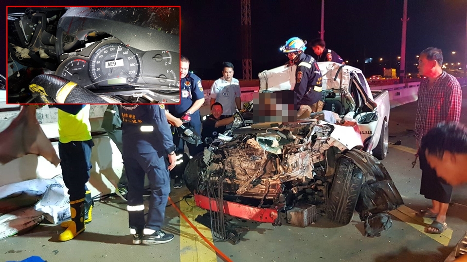 สมุทรสาคร 15 มิ.ย.-รถกระบะแต่งซิ่งพุ่งชนท้ายรถบรรทุกสิบล้อกลางสะพานข้ามแม่น้ำท่าจีน หนุ่มคนขับดับสยองคาซากรถ พยานเผยเห็นรถกระบะ 2 คันขับแข่งกันมา ก่อนรถคันหนึ่งเสียหลักพุ่งเสยท้ายรถสิบล้อ