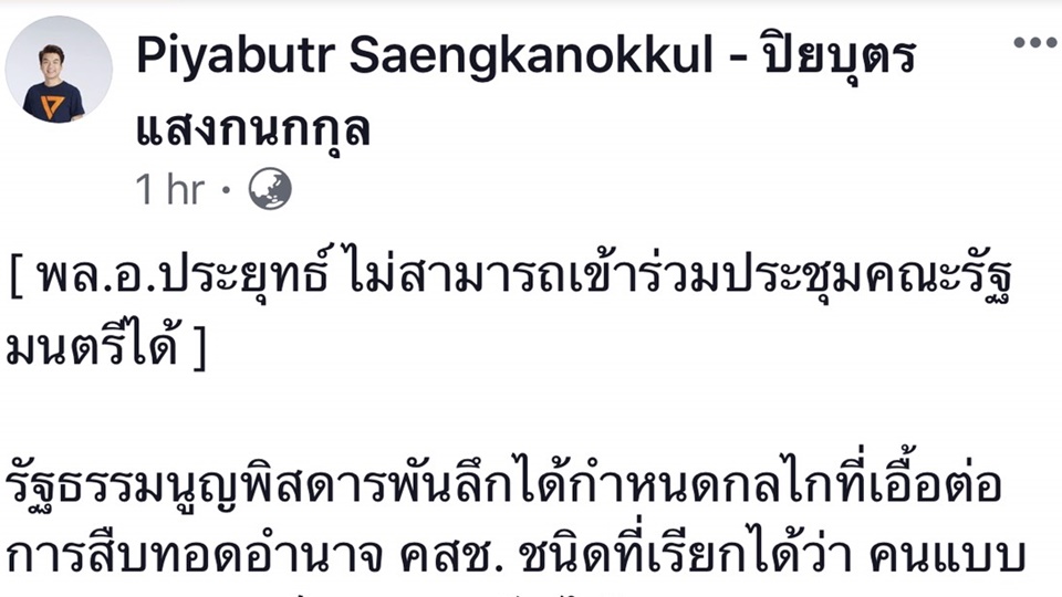 ผู้สื่อข่าวรายงานว่า นายปิยบุตร แสงกนกกุล เลขาธิการพรรคอนาคตใหม่ และ ส.ส.บัญชีรายชื่อ โพสต์ขอความผ่านเฟสบุ๊ค ว่า พล.อ.ประยุทธ์ จันทร์โอชา ไม่สามารถเข้าร่วมประชุมคณะรัฐมนตรีได้ รัฐธรรมนูญพิสดารพันลึกได้กำหนดกลไกที่เอื้อต่อการสืบทอดอำนาจ คสช. ชนิดที่เรียกได้ว่า คนแบบ พล.อ.ประยุทธ์ สามารถเป็นได้ทุกอย่าง ครองอำนาจอย่างต่อเนื่องแบบไร้รอยตะเข็บ
