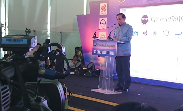 พล.อ.ประยุทธ์ จันทร์โอชา นายกรัฐมนตรี เป็นประธานในพิธีเปิดตัวผลิตภัณฑ์ OTOP ประชารัฐ เพื่อจำหน่ายบนเครื่องบินของสายการบินไทย “OTOP ไทย จากท้องถิ่น บินสู่ท้องฟ้า” โดยได้ขอบคุณทุกหน่วยงานที่ทำให้เกิดการจัดงานในครั้งนี้ ซึ่งทำให้สินค้า OTOP ที่เป็นภูมิปัญญาและฝีมือที่เป็นเอกลักษณ์ของคนไทยออกสู่สายตาของชาวโลก ผ่านสายการบินของไทย เพื่อเป็นช่องทางเพิ่มยอดและมูลค่าการจำหน่ายให้กับผู้ผลิต โดยขอให้พัฒนาผลิตภัณฑ์ ทั้งเรื่องคุณภาพและการออกแบบ ที่สำคัญต้องทำให้ผู้ซื้อรู้ว่าจะนำสินค้าไปใช้อย่างไร รวมทั้งจะผลักดันให้สินค้า OTOP สามารถวางจำหน่ายได้ทุกช่องทาง
