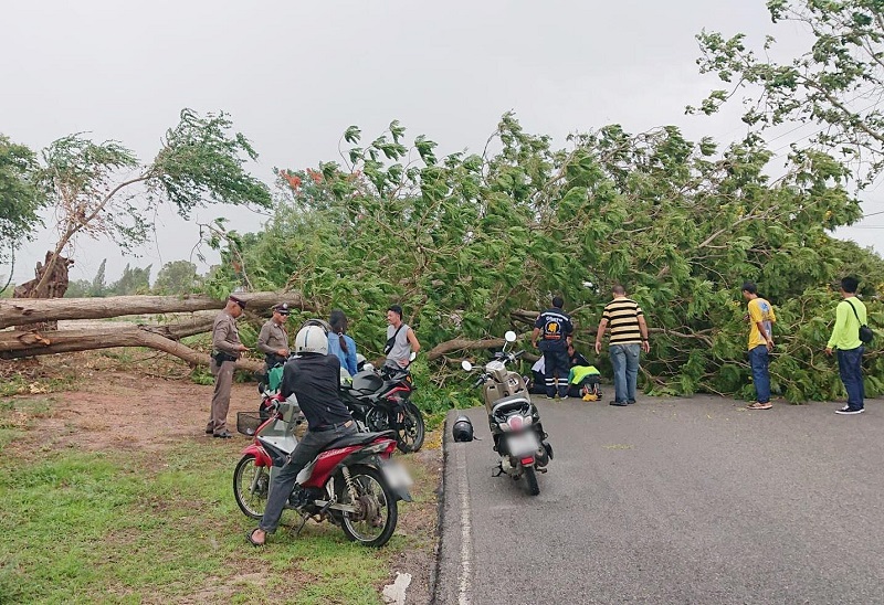 เมื่อเวลา 12.30 น. (20 มิ.ย.) พ.ต.ท.ยศวริศ ทองสงโสม พนักงานสอบสวน สภ.เมืองประจวบคีรีขันธ์ รับแจ้งเหตุมีผู้บาดเจ็บจากเหตุต้นไม้ใหญ่โค่นล้มบนถนนสายใหม่ ประจวบ –คลองวาฬ หมู่ 5 ต.เกาะหลัก อ.เมือง จึงประสานมูลนิธิสว่างประจวบธรรมสถานเข้าช่วยเหลือพบผู้บาดเจ็บเป็นหญิง อายุ 47 ปี ลูกจ้างร้านหมูกระทะ ใกล้กันมีรถจักรยานยนต์ล้มอยู่ เจ้าหน้าที่เร่งนำอุปกรณ์ตัดต้นไม้ออก พร้อมนำตัวส่งโรงพยาบาลประจวบคีรีขันธ์ ล่าสุดเสียชีวิตแล้ว