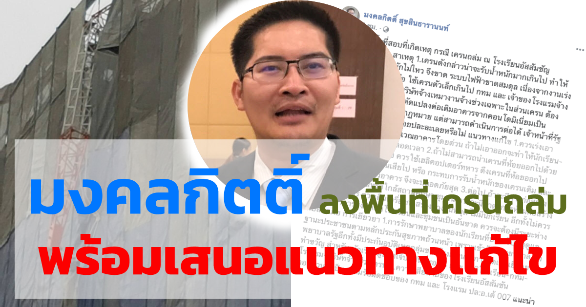 เมื่อวันที่ 20 มิ.ย. 62 นายมงคลกิตติ์ สุขสินธารานนท์ ส.ส.บัญชีรายชื่อและหัวหน้าพรรคไทยศรีวิไลย์ โพสต์เฟซบุ๊กกรณีเหตุเครนถล่มที่รร.อัสสัมชัญ คอนเเวนต์ โดยเป็นการโพสต์ข้อความจากการลงสำรวจพื้นที่เกิดเหตุ ดังนี้