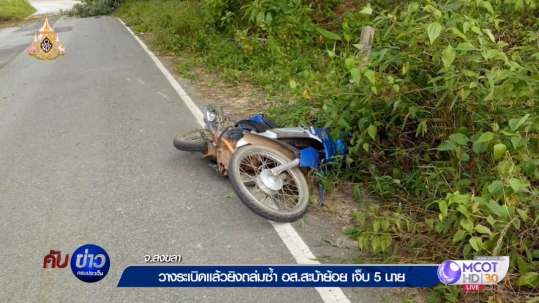 สงขลา 21 มิ.ย.-คนร้ายลอบวางระเบิดและยิงถล่มซ้ำ อส.อำเภอสะบ้าย้อย จ.สงขลา บาดเจ็บ 5 นายขณะออกลาดตระเวนเส้นทางรักษาความปลอดภัยครู และเกิดการยิงปะทะกันดุเดือด