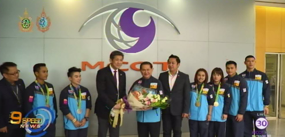 อสมท 18 ส.ค. – พล.ต.อินทรัตน์ ยอดบางเตย ประธานที่ปรึกษาสมาคมกีฬายกน้ำหนักแห่งประเทศไทย พร้อมด้วยนักกีฬายกน้ำหนักทีมชาติไทย ชุดโอลิมปิกเกมส์ 2016 นำโดย “น้องแนน” โสภิตา ธนสาร เจ้าของเหรียญทองรุ่น 48 กก.หญิง “น้องฝ้าย” สุกัญญา ศรีสุราช เหรียญทองรุ่น 58 กก.หญิง “น้องแต้ว” พิมศิริ ศิริแก้ว เหรียญเงินรุ่น 58 กก.หญิง และ “เจ้าดุ่ย” สินธุ์เพชร กรวยทอง เหรียญทองแดงรุ่น 56 กก.ชาย เดินทางมาขอบคุณบริษัท อสมท จำกัด (มหาชน) ที่ได้นำเสนอข่าวสารทีมนักกีฬายกน้ำหนักมาโดยตลอด จนประสบความสำเร็จในรีโอเกมส์ โดยมีนายศิวะพร ชมสุวรรณ กรรมการผู้อำนวยการใหญ่ บมจ.อสมท ให้การต้อนรับและมอบช่อดอกไม้แสดงความยินดีกับสมาคมกีฬายกน้ำหนักฯ ที่สามารถคว้ามาได้ 2 เหรียญทอง 1 เหรียญเงิน และ 1 เหรียญทองแดง ซึ่ง “น้องแนน” และ “น้องฝ้าย” กล่าวว่า ดีใจและขอบคุณที่ให้การต้อนรับอย่างอบอุ่น. – สำนักข่าวไทย