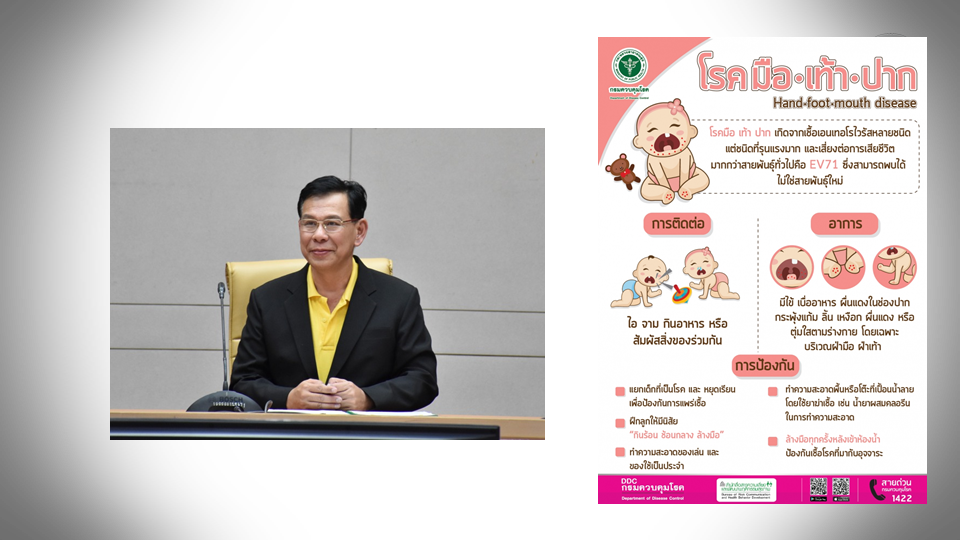 ‘ขอให้ผู้ปกครองหมั่นล้างมือให้เด็ก หากมีไข้ บ่นเจ็บในปาก กลืนน้ำลายไม่ได้ ไม่กินอาหาร ไม่ดูดนม อาจมีน้ำลายไหล ขอให้สังเกตภายในปากว่ามีตุ่มแผล หรือมีตุ่มพองสีขาวขุ่น รอบๆ เป็นสีแดงที่นิ้วมือ นิ้วเท้า ฝ่ามือ ฝ่าเท้า ส้นเท้า กดเจ็บ ไม่ค่อยแตกเป็นแผล ในเด็กเล็กๆ บางครั้งจะพบมีผื่นนูนสีแดงเล็กที่ก้น ส้นเท้า อาจเป็นโรคมือเท้าปาก ขอให้หยุดเรียน เพื่อป้องกันแพร่เชื้อสู่เด็กคนอื่น แต่หากมีอาการแทรกซ้อน เช่น ไข้สูง ซึม อาเจียน หอบ ให้รีบนำไปรับการรักษาที่โรงพยาบาลทันที’ นพ.สุขุมกล่าว