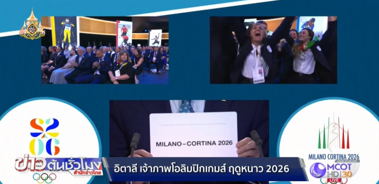 25 มิ.ย. – โทมัส บัค ประธานคณะกรรมการโอลิมปิกสากล (ไอโอซี) ประกาศให้เมืองมิลาน และคอร์ตินา ของอิตาลี เป็นเจ้าภาพจัดการแข่งขันโอลิมปิกเกมส์ ฤดูหนาว ปี 2026 ด้วยการเอาชนะกรุงสตอกโฮล์ม และเมืองอาเร ของสวีเดน คู่แข่งเพียงหนึ่งเดียวไป 47-34 คะแนน