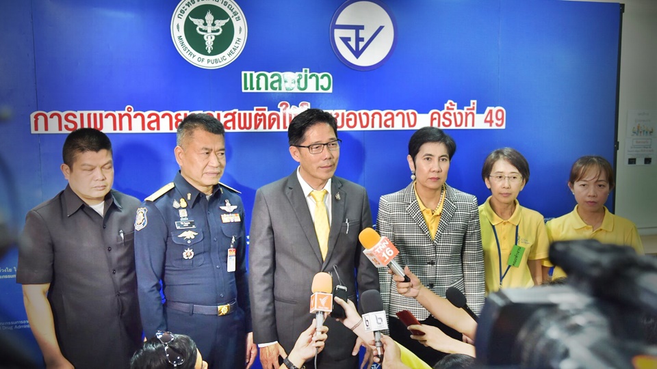 นพ.ธเรศ กรัษนัยรวิวงค์ เลขาธิการคณะกรรมการอาหารและยา เปิดเผยว่า กระทรวงสาธารณสุข โดยสำนักงานคณะกรรมการอาหารและยา(อย.) ได้ทำการตรวจรับยาเสพติดให้โทษของกลางที่ศาลชั้นต้นมีคำสั่งหรือพิพากษาให้ริบของกลางก่อนส่งเข้าเตาเผา จำนวนรวมกว่า 16,467 กิโลกรัม จาก 6,910 คดี มูลค่ารวมกว่า 20,047 ล้านบาท โดยคณะทำงานตรวจรับยาเสพติดให้โทษของกลาง ประกอบด้วยหน่วยงานต่าง ๆ ได้แก่ สำนักงานคณะกรรมการป้องกันและปราบปรามยาเสพติด (ป.ป.ส.) สำนักงานตำรวจแห่งชาติ โดยสถานีตำรวจภูธรเมืองนนทบุรี กรมวิทยาศาสตร์การแพทย์ สำนักงานพิสูจน์หลักฐานตำรวจศูนย์อำนวยการป้องกันและปราบปรามยาเสพติดกองทัพบก และสำนักงานคณะกรรมการอาหารและยา(อย.) ร่วมกันตรวจพิสูจน์ยาเสพติด