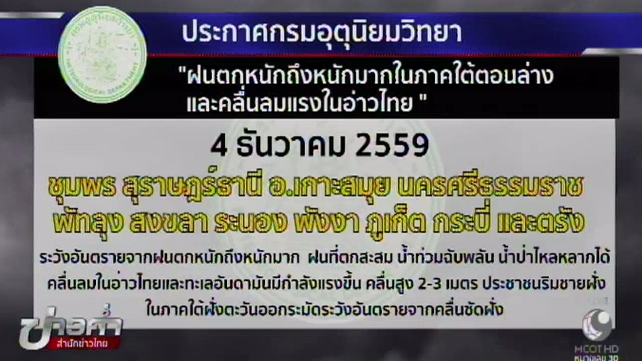 ภูมิภาค 4 ธ.ค.-ประกาศกรมอุตุนิยมวิทยา ฉบับที่ 22 เตือนว่าวันพรุ่งนี้ จังหวัดประจวบคีรีขันธ์ ชุมพร สุราษฎร์ธานี นครศรีธรรมราช พัทลุง สงขลา ระนอง พังงา ภูเก็ต และกระบี่ จะมีฝนตกหนักถึงหนักมาก จึงขอให้ประชาชนในบริเวณดังกล่าวระมัดระวังอันตราย จากฝนตกหนักถึงหนักมาก ฝนที่ตกสะสม น้ำท่วมฉับพลัน น้ำป่าไหลหลากได้และหลีกเลี่ยงการสัญจรผ่านบริเวณที่มีน้ำท่วม