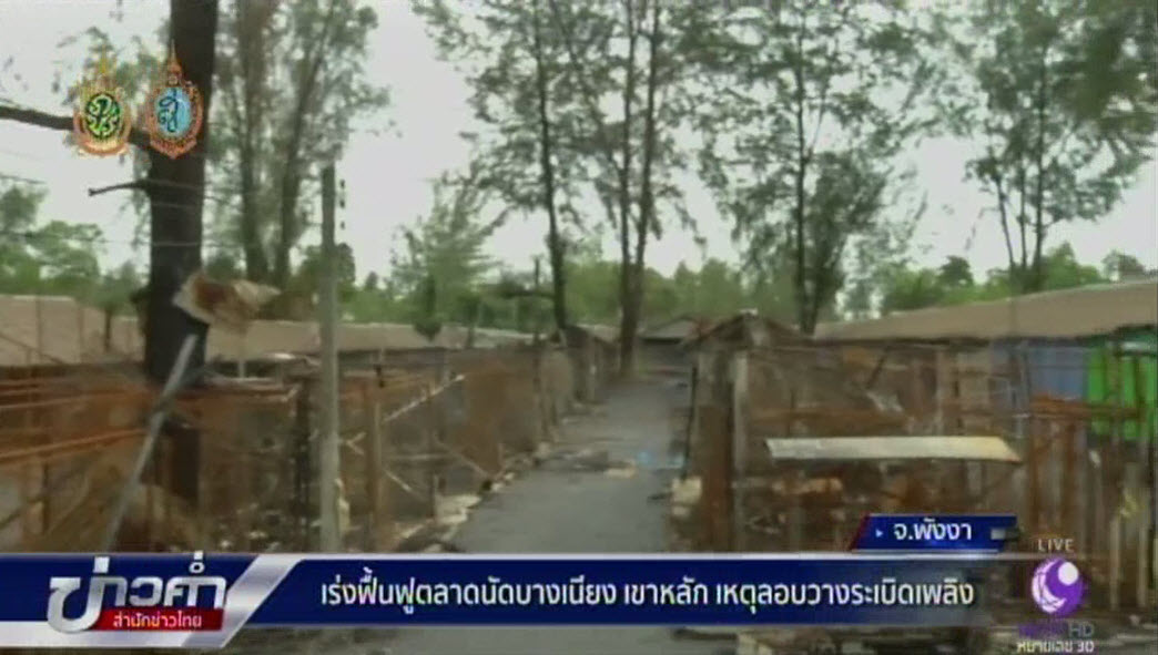 พังงา 17 ส.ค.-ตลาดนัดบางเนียงในพื้นที่เขาหลัก จ.พังงา เป็นอีกหนึ่งพื้นที่ที่คนร้ายลอบก่อเหตุวางระเบิดเพลิง ทำให้ผู้ค้าหลายสิบรายได้รับความเดือดร้อน แต่ทั้งหมดยืนยันจะกลับมาค้าขายที่เดิมต่อไป มั่นใจการค้าต้องฟื้นตัวในไม่ช้า