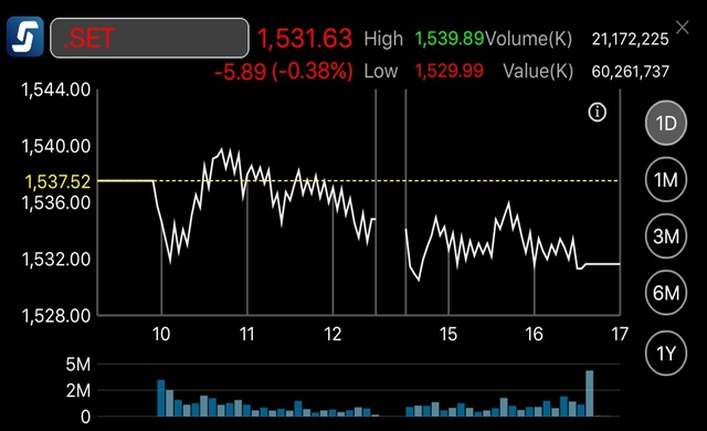 ตลท. 17 ส.ค. – ผู้สื่อข่าวรายงานว่าดัชนีหุ้นไทยปิดการซื้อขายวันนี้ (17 ส.ค.) ที่ระดับ 1,531.63 ล้านบาท ลดลง 5.89 จุด หรือ ร้อยละ 0.38 มูลค่าการซื้อขาย 60,261.74 ล้านบาท โดยดัชนีเคลื่อนไหวแดนลบเป็นส่วนใหญ่สูงสุดของวันที่ระดับ 1,539.89 จุด และต่ำสุดที่ 1,529.99 จุด