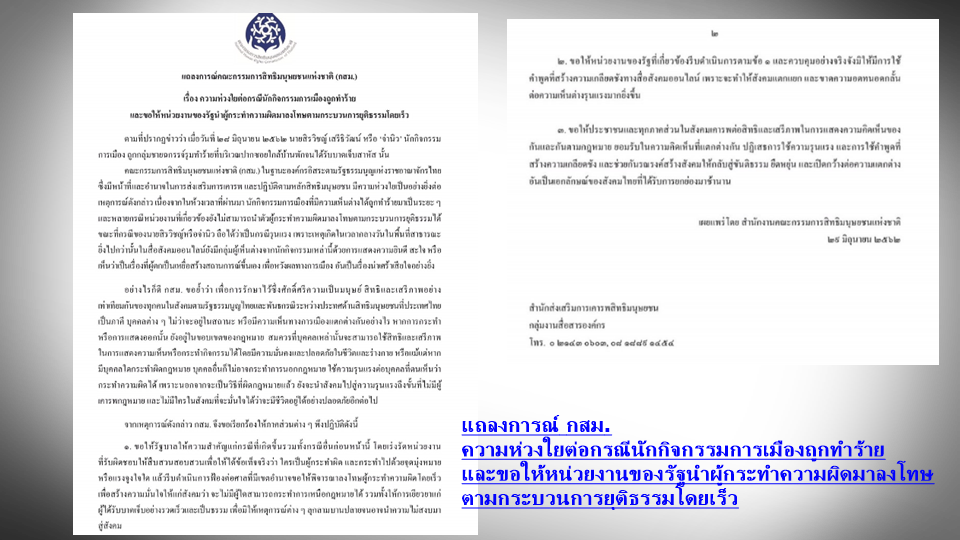 กรุงเทพฯ 29 มิ.ย.-กสม.ออกแถลงการณ์คณะกรรมการสิทธิฯ แสดงความห่วงใยต่อกรณีนักกิจกรรมการเมืองถูกทำร้ายและขอให้หน่วยงานของรัฐนำผู้กระทำความผิดมาลงโทษตามกระบวนการยุติธรรมโดยเร็ว