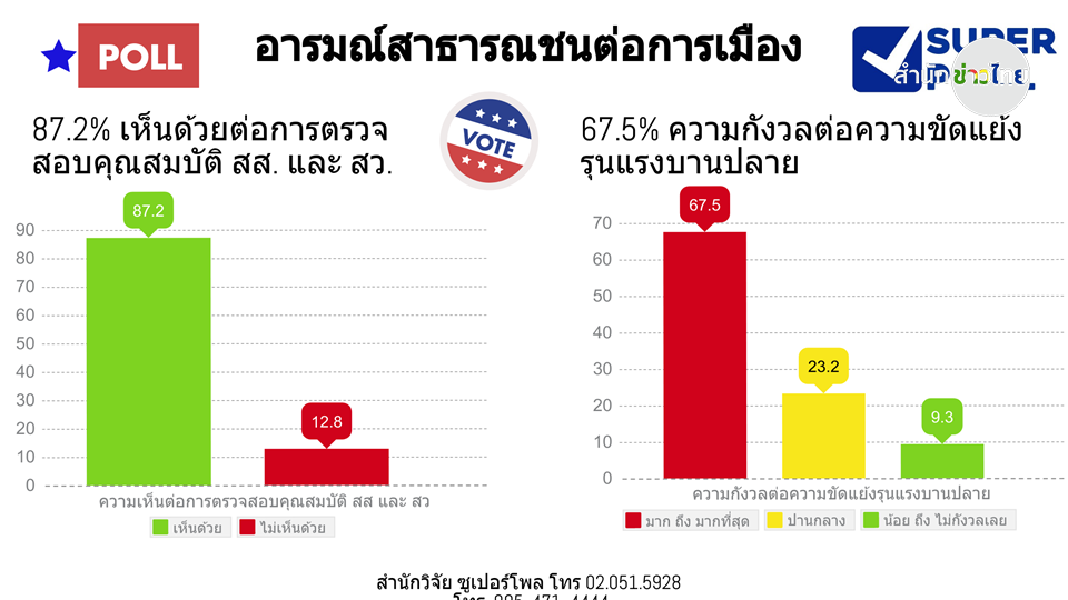 ซูเปอร์โพล 30 มิ.ย.- ซูเปอร์โพลชี้คนส่วนใหญ่ร้อยละ 67.5 กังวลการเมืองจะขัดแย้งรุนแรงบานปลาย และร้อยละ 46.9 ให้โอกาสรัฐบาล พล.อ.ประยุทธ์ แก้ปัญหาเดือดร้อนของประชาชนไม่เกิน 1 ปี