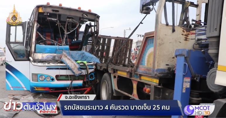 ฉะเชิงเทรา 30 มิ.ย.-รถบัส รับ-ส่งนักเรียน พุ่งชนท้ายรถสิบล้อ ก่อนที่จะเสียหลักไปเฉี่ยวชนรถเก๋ง ทำให้มีผู้บาดเจ็บ 25 คน ส่วนใหญ่เป็นนักเรียนระดับ ปวส.