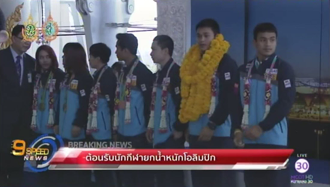ฮีโร่โอลิมปิกทัพนักกีฬายกน้ำหนักทีมชาติไทยเดินทางกลับมาถึงท่าอากาศยานสุวรรณภูมิแล้ว นำทีมโดย “น้องแนน” โสภิตา ธนสาร เจ้าของเหรียญทองยกน้ำหนักรุ่น 48 กก.หญิง และ “น้องฝ้าย” สุกัญญา ศรีสุราช เหรียญทองรุ่น 58 กก.หญิง และ “น้องแต้ว” พิมศิริ ศิริแก้ว เหรียญเงินรุ่น 58 กก.หญิง และ “เจ้าดุ่ย” สินธุ์เพชร์ กรวยทอง เหรียญทองแดงรุ่น 56 กก. รวม 9 ชีวิต พร้อมด้วยนางบุษบา ยอดบางเตย นายกสมาคมยกน้ำหนักฯ ร่วมด้วยนักกีฬายิงปืนอีก 4 คน มี พล.ต.อินทรัตน์ ยอดบางเตย ประธานที่ปรึกษาสมาคมยกน้ำหนักแห่งประเทศไทย เข้าไปรับภายในท่าอากาศยาน