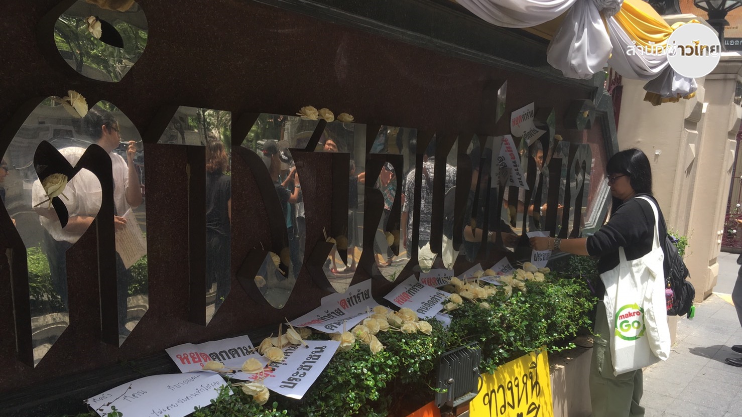 กลุ่มผู้ชุมนุมได้วางพวงหรีด และดอกไม้จันทน์ บนป้ายสำนักงานตำรวจแห่งชาติ พร้อมเรียกร้องให้ตำรวจเร่งรัดติดตามตัวคนร้ายมาดำเนินคดีโดยเร็ว ก่อนเดินไปจัดกิจกรรมต่อย่านสยาม สแควร์ อย่างสงบ.-สำนักข่าวไทย