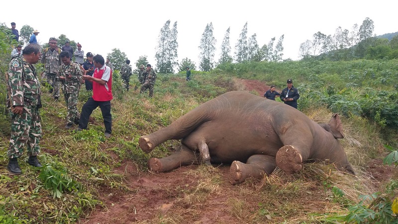 เลย 2 ก.ค.- จนท.พิสูจน์ช้างป่าภูหลวงล้มกลางไร่มันสำปะหลัง คาดท้องอืดอย่างแรงจากปริมาณมันสำปะหลังกินเข้าไปมาก