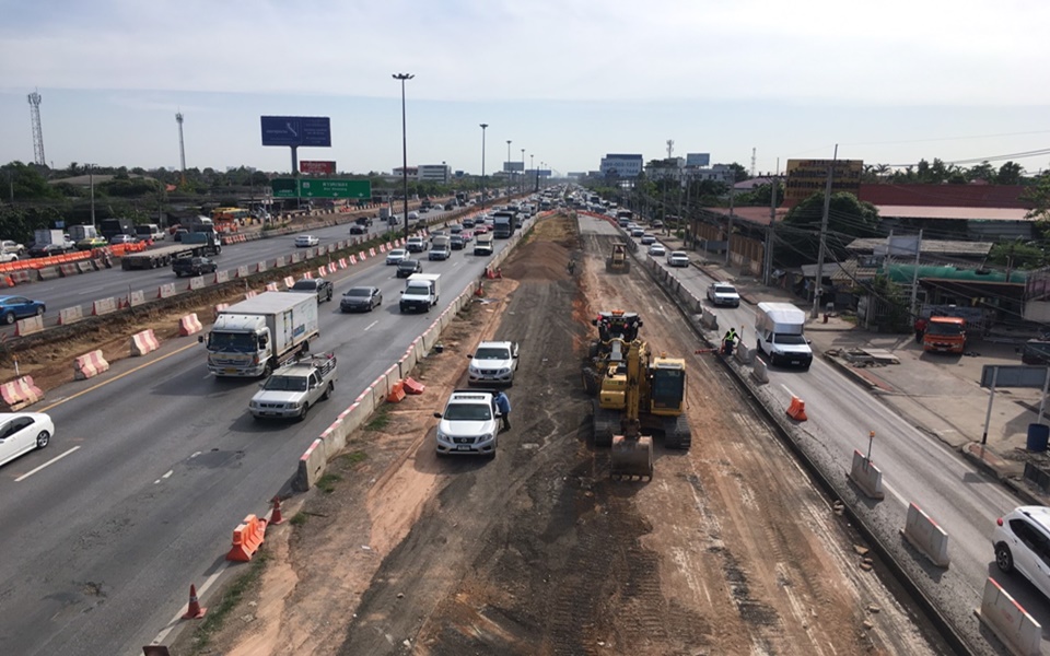 สำหรับถนนเดิม ประกอบด้วย ทางขนาน 2 ช่องจราจร ทางหลัก 3 ช่องจราจร ขาเข้า กทม. และขาออก กทม. ข้างละ 5 ช่องจราจร รวม 10 ช่องจราจร ลักษณะการก่อสร้างทั้ง 3 ตอนทางขนานจะก่อสร้างขยายคันทางจากเดิม 2 ช่องจราจรเป็น 3 ช่องจราจร โดยทางขนานใหม่จะสูงขึ้นจากทางขนานเดิมเฉลี่ยประมาณ 0.40 เมตร ส่วนทางหลักจะก่อสร้างขยายคันทางจากเดิม 3 ช่องจราจร เป็น 4 ช่องจราจร โดยทางหลักใหม่จะสูงขึ้นจากทางหลักเดิมเฉลี่ยประมาณ 0.50 – 0.70 เมตร รวม 14 ช่องจราจร (ขาเข้า กทม. และขาออก กทม.ข้างละ 7 ช่องจราจร) พร้อมก่อสร้างสะพานกลับรถ 2 แห่ง ที่ กม. 12+000.000 (แสมดำ) และ กม. 16+000.000 (ก่อนถึงซอยพันท้ายนรสิงห์) และเมื่อทั้ง 3 ตอนก่อสร้างเสร็จจะเพิ่มขีดความสามารถรองรับปริมาณจราจรที่มีอยู่ในปัจจุบันและคาดว่าจะเพิ่มสูงขึ้นในอนาคต อีกทั้งยังลดระยะเวลาการเดินทางของโครงข่ายถนนโดยรอบ ส่งผลให้ผู้ใช้เส้นทางได้รับความสะดวกสบายและมีความปลอดภัยในการใช้เส้นทางเพิ่มมากขึ้น คาดว่าอีกประมาณ 3 เดือน งานก่อสร้างทางขนาน ช่วงแสมดำ – มหาชัยเมืองใหม่ จาก 2 ช่องจราจร เป็น 3 ช่องจราจร ทั้งขาออกและขาเข้าจะเสร็จ เนื่องจากการรื้อย้ายสาธารณูปโภคที่ติดขัดใกล้เสร็จ