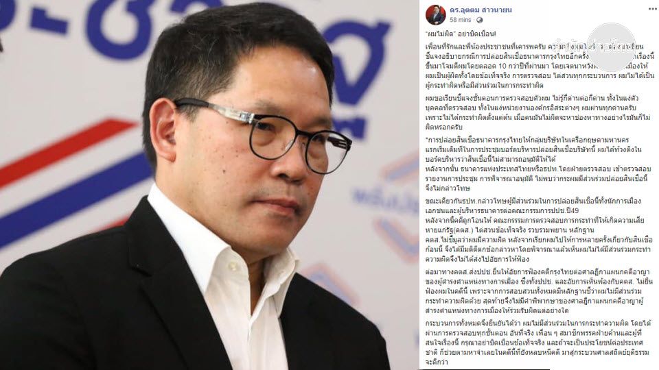 ผู้สื่อข่าวรายงานว่า นายอุตตม สาวนายน หัวหน้าพรรคพลังประชารัฐ ได้โพสต์เฟซบุ๊กส่วนตัว ชี้แจงกรณีฝ่ายค้านเตรียมอภิปรายคุณสมบัติการเป็นรัฐมนตรี โดยมุ่งเน้นไปที่ประเด็นการปล่อยสินเชื่อธนาคารกรุงไทย ระบุว่า “ผมไม่ผิด อย่าบิดเบือน” โดยย้ำว่า ได้ผ่านการตรวจสอบมาหลายครั้ง ทั้งในแง่ตัวบุคคลที่ตรวจสอบ ทั้งในแง่หน่วยงานองค์กรอิสระต่างๆ ซึ่งก็ผ่านมาทุกครั้ง เพราะไม่ได้ทำผิดตั้งแต่ต้น ที่มีการหยิบยกเรื่องนี้มาโจมตีตนตลอด 10 กว่าปีที่ผ่านมา เป็นเจตนาหวังผลทางการเมือง ให้ตนเป็นผู้กระทำผิด ทั้งโดยข้อเท็จจริง การตรวจสอบ ไต่สวนทุกกระบวนการ ตนไม่ได้เป็นผู้กระทำผิดหรือมีส่วนร่วมในการกระทำผิด