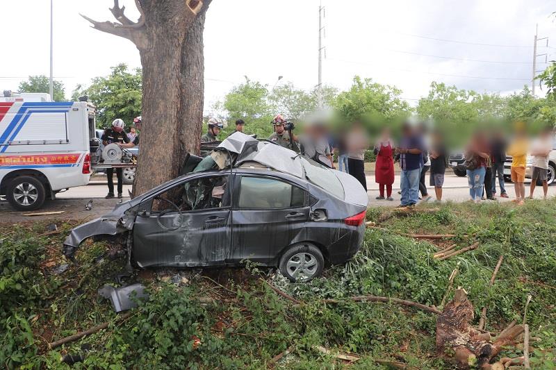 ลำปาง 5 ก.ค.- เกิดอุบัติเหตุถนนเมืองลำปาง รถเก๋งชนต้นไม้เต็มแรงพังทั้งคัน ชายคนขับเสียชีวิต