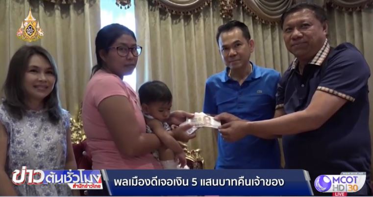 ชลบุรี 5 ก.ค.-พลเมืองดีเจอถุงเงิน 5 แสนบาทตกอยู่ นำส่งคืนเจ้าของ ด้านเจ้าของเงินเผยดีใจที่สังคมยังมีคนดีแบบนี้ พร้อมให้รางวัล 5 หมื่นบาท