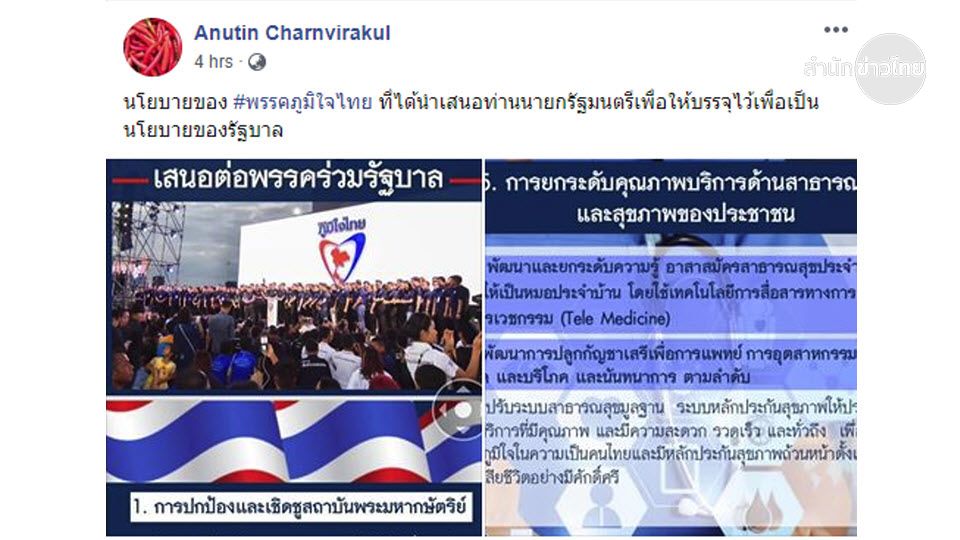 กรุงเทพฯ 6 ก.ค.- นายอนุทิน ชาญวีรกูล หัวหน้าพรรคภูมิใจไทย โพสต์เฟสบุ๊คส่วนตัว Anutin Charnvirakul ว่า พรรคภูมิใจไทยนำเสนอนโยบายต่อนายกรัฐมนตรี เพื่อให้บรรจุไว้เพื่อเป็นนโยบายของรัฐบาลแล้ว โดยยกตัวอย่างนโยบายหลักและนโยบายด้านสาธารณสุข ที่นำเสนอไป เช่น การปกป้องและเชิดชูสถาบันพระมหากษัตริย์ ยึดมั่นและธำรงไว้ซึ่งการปกครองระบอบประชาธิปไตยอันมีพระมหากษัตริย์ทรงเป็นประมุขตามรัฐธรรมนูญแห่งราชอาณาจักรไทย น้อมนำหลักปรัชญาเศรษฐกิจพอเพียงและศาสตร์พระราชา มาเป็นแนวทางในการพัฒนาประเทศไปสู่ความมั่นคง มั่งคั่ง และยั่งยืน