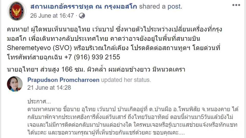 ทางญาติพี่น้องจึงได้ประสานกับเจ้าหน้าที่ตำรวจตรวจคนเข้าเมือง ทราบว่านายอุไทยไม่ได้เดินทางกลับเข้ามาประเทศไทย ตนจึงได้ลงประกาศหาคนหายในเพจต่างๆของเฟซบุ๊ก เพื่อตามหาพี่ชาย รวมทั้งเพจคนไทยในรัสเซียและคนไทยในฮังการี