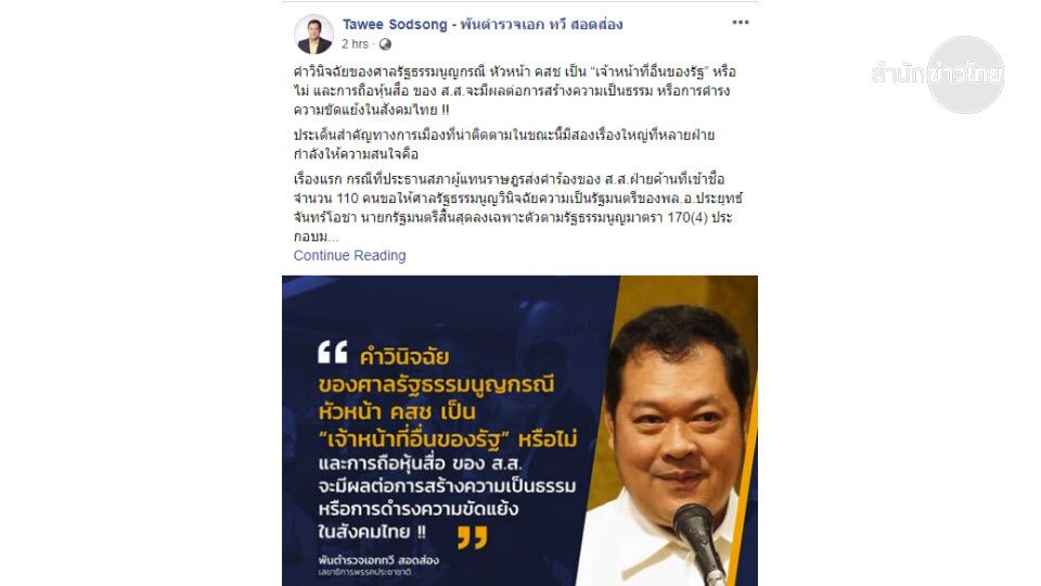 พ.ต.อ.ทวี สอดส่อง เลขาธิการพรรคประชาชาติ โพสเฟสบุ๊คส่วนตัว “Tawee Sodsong” ระบุขณะนี้มีประเด็นสำคัญทางการเมืองที่น่าติดตาม 2 เรื่องใหญ่ที่หลายฝ่ายกำลังให้ความสนใจ คือ กรณีที่ประธานสภาผู้แทนราษฎรส่งคำร้องของ ส.ส.ฝ่ายค้านที่เข้าชื่อจำนวน 110 คน ขอให้ศาลรัฐธรรมนูญวินิจฉัยความเป็นรัฐมนตรีของ พล.อ.ประยุทธ์ จันทร์โอชา นายกรัฐมนตรี สิ้นสุดลงเฉพาะตัว ตามรัฐธรรมนูญมาตรา 170(4) ประกอบมาตรา 160(6) และมาตรา 98(15) เหตุเป็นเจ้าหน้าที่อื่นของรัฐหรือไม่ และกรณีที่มีการส่งคำร้องให้ศาลรัฐธรรมนูญวินิจฉัยสมาชิกภาพของ ส.ส. ทั้งฝ่ายค้านและฝ่ายรัฐบาลสิ้นสุดลง เพราะถือหุ้นในกิจการหนังสือพิมพ์หรือสื่อมวลชนหรือไม่ ซึ่งจะต้องติดตามกันต่อไป เพราะคำวินิจฉัยของศาลรัฐธรรมนูญทั้ง 2 กรณีดังกล่าว จะมีผลต่อการสร้างความเป็นธรรมให้เกิดสันติภาพ หรือดำรงความขัดแย้งในสังคมไทย