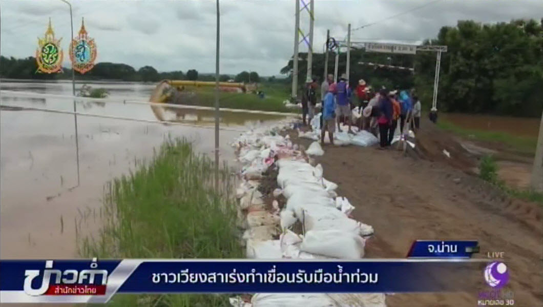 ภูมิภาค 16 ส.ค.-สถานการณ์น้ำท่วมในจังหวัดน่านเริ่มคลี่คลายแล้ว แต่ที่ อ.เวียงสา ชาวบ้านต้องช่วยกันทำกระสอบทรายเพื่อกั้นตามแนวแม่น้ำน่าน เพื่อรับมือกับน้ำหลากจากอำเภอเมือง ขณะที่กรมชลประทานคาด 23.00 น.คืนนี้ จะมีน้ำล้นตลิ่งที่ลุ่มต่ำนอกคันกั้นน้ำบริเวณ อ.เมืองแพร่