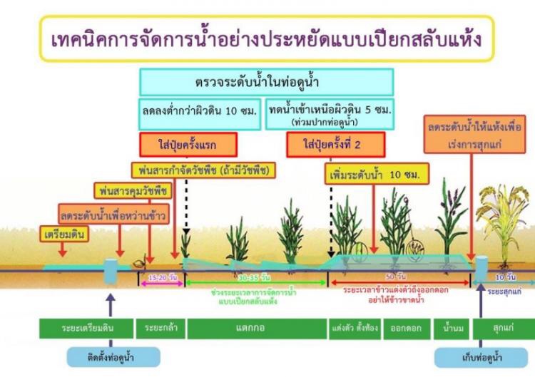 ทั้งนี้ กรมการข้าวได้วิจัยการจัดการน้ำแบบเปียกสลับแห้งในการทำนา พบว่า สามารถช่วยประหยัดน้ำได้ถึงร้อยละ 30 – 50 ขึ้นอยู่กับชนิดของดินและสภาพอากาศในแต่ละพื้นที่ ซึ่งการทำนาแบบให้น้ำขังตลอดฤดูปลูกซึ่งเป็นวิธีปกติของชาวนาทั่วไปจะต้องใช้น้ำประมาณ 1,200 ลบ.ม./ไร่/ฤดู อีกทั้งยังช่วยลดต้นทุนค่าน้ำมันเชื้อเพลิงสูบน้ำได้ร้อยละ 30 นอกจากนี้ในสภาพดินแห้ง รากข้าวได้รับอากาศสามารถแตกรากข้าวใหม่มากขึ้นเพิ่มประสิทธิภาพในการดูดซับธาตุอาหารได้ดีขึ้น ต้นข้าวแข็งแรงขึ้น ทนต่อโรคและแมลงศัตรูข้าวได้ดีขึ้น ช่วยลดการใช้ปุ๋ยและสารเคมีป้องกันกำจัดศัตรูข้าวอีกทางหนึ่ง ชาวนาที่สนใจหรือมีข้อสงสัย สามารถสอบถามได้ที่ศูนย์วิจัยข้าวหรือศูนย์เมล็ดพันธุ์ข้าวในพื้นที่ . – สำนักข่าวไทย