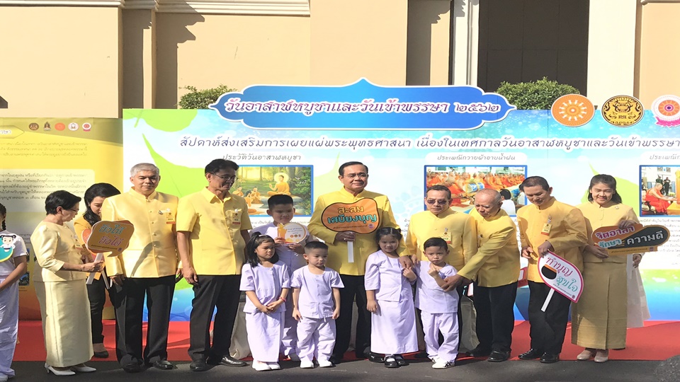 ก่อนการประชุมคณะรัฐมนตรี (ครม.) พล.อ.ประยุทธ์ จันทร์โอชา นายกรัฐมนตรีและหัวหน้าคณะรักษาความสงบแห่งชาติ (คสช.) ร่วมกิจกรรมรณรงค์เชิญชวนประชาสัมพันธ์การจัดงานสัปดาห์ส่งเสริมพระพุทธศาสนา เนื่องในเทศกาลอาสาฬหบูชาและเข้าพรรษา ประจำปี 2562 ที่จะจัดขึ้นระหว่างวันที่ 11-17 กรกฎาคม 2562 ทั้งในส่วนกลางและส่วนภูมิภาค พร้อมชมนิทรรศการองค์ความรู้วันอาสาฬหบูชาและวันเข้าพรรษา ข้อมูล ประวัติความเป็นมาของวัด 10 วัดที่จะนำเทียนพรรษาไปถวาย ผ่านป้ายประชาสัมพันธ์ดิจิทัล (DIGITAL SIGNAGE KIOSK)
