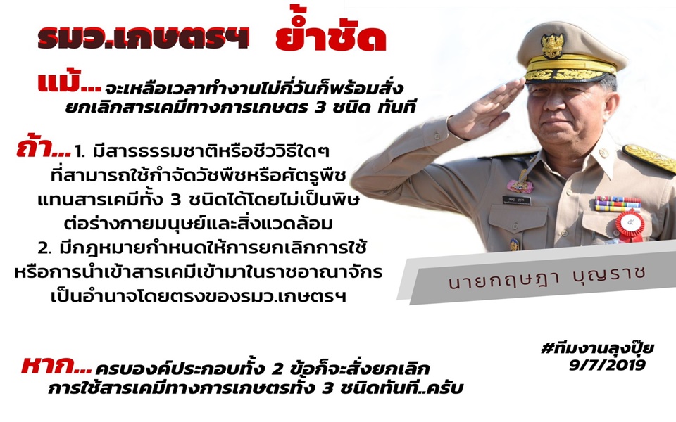 นายกฤษฎา บุญราช รัฐมนตรีว่าการกระทรวงเกษตรและสหกรณ์ กล่าวว่า แม้จะเหลือเวลาทำงานไม่กี่วัน ก็พร้อมสั่งยกเลิกสารเคมีทางการเกษตร 3 ชนิด คือ พาราควอต ไกลโฟเซตที่ใช้กำจัดวัชพืช และคลอร์ไพริฟอสที่ใช้กำจัดแมลงศัตรูพืช ถ้ามีองค์ประกอบ 2 ข้อ คือ มีสารชีวพันธุ์หรือชีววิธีใด ๆ ที่สามารถใช้กำจัดวัชพืชหรือศัตรูพืชแทนสารเคมีทั้ง 3 ชนิดได้ โดยไม่เป็นพิษต่อร่างกายมนุษย์และสิ่งแวดล้อม รวมทั้งมีกฎหมายกำหนดให้การยกเลิกการใช้หรือการห้ามนำเข้าสารเคมีเข้ามาในราชอาณาจักรเป็นอำนาจโดยตรงของรัฐมนตรีเกษตรฯ