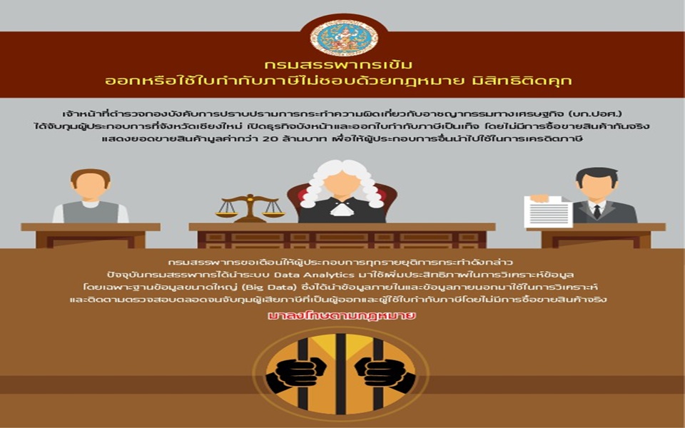 ตามที่เจ้าหน้าที่ตำรวจกองบังคับการปราบปรามการกระทำความผิดเกี่ยวกับอาชญากรรมทางเศรษฐกิจ (บก.ปอศ.) ได้จับกุมผู้ประกอบการที่จังหวัดเชียงใหม่ เปิดธุรกิจบังหน้าและออกใบกำกับภาษีเป็นเท็จ โดยไม่มีการซื้อขายสินค้าจริง แสดงยอดขายสินค้ามูลค่ากว่า 20 ล้านบาท เพื่อให้ผู้ประกอบการอื่นนำไปใช้ในการเครดิตภาษี