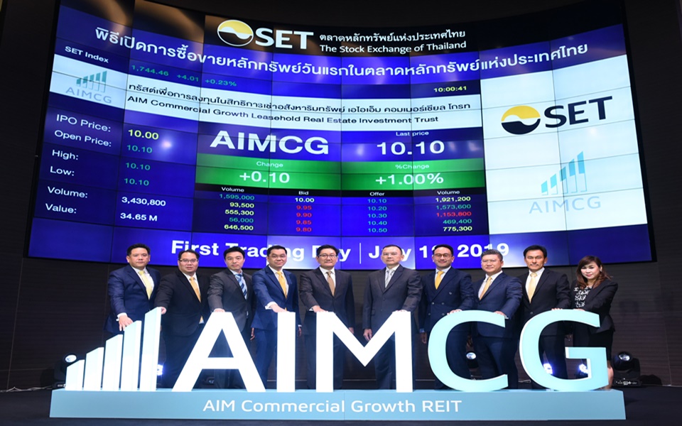 ผู้สื่อข่าวรายงานว่าทรัสต์เพื่อการลงทุนในสิทธิการเช่าอสังหาริมทรัพย์ เอไอเอ็ม คอมเมอร์เชียล โกรท หรือ AIMCG ได้เข้าจดทะเบียนและเริ่มซื้อขายในตลาดหลักทรัพย์ฯ ในกลุ่มอสังหาริมทรัพย์และก่อสร้างวันแรก โดยราคาเปิดที่ 10.10 บาท เพิ่มขึ้น 0.10 บาท หรือร้อยละ 1 จากราคาขาย IPO ที่ 10 บาทต่อหน่วย