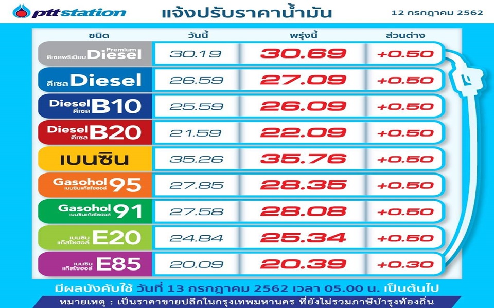 กรุงเทพฯ 12 ก.ค. – ปตท.-บางจากฯ ปรับราคาน้ำมันทุกชนิดขึ้น 50 สตางค์ต่อลิตร ยกเว้น E85 ขึ้น 30 สตางค์ต่อลิตร มีผล 13 ก.ค.นี้