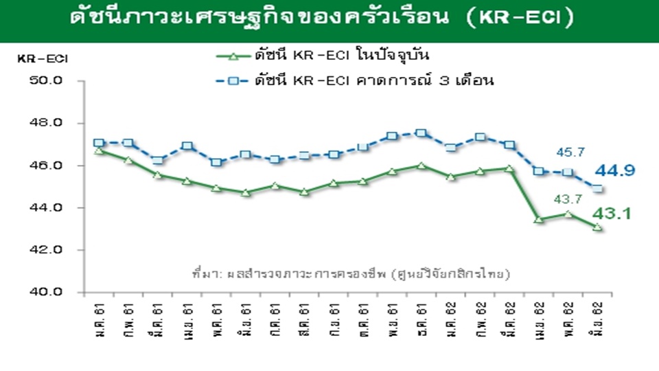 บริษัท ศูนย์วิจัยกสิกรไทย จำกัด เผยดัชนีภาวะเศรษฐกิจและการครองชีพของครัวเรือนไทยและดัชนีภาวะเศรษฐกิจและการครองชีพของครัวเรือนช่วงอีก 3 เดือนข้างหน้า สำรวจเดือนมิถุนายน 2562 ปรับตัวลดลงมาอยู่ที่ระดับ 43.1 และ 44.9 ตามลำดับ โดยครัวเรือนมีความกังวลต่อภาวะเศรษฐกิจและการครองชีพของตนเองทั้งในปัจจุบันและในอนาคตมากขึ้น โดยเฉพาะในประเด็นเรื่องระดับราคาสินค้าภายในประเทศ ค่าใช้จ่าย (ไม่รวมภาระหนี้สิน) รวมถึงรายได้และการมีงานทำของครัวเรือน