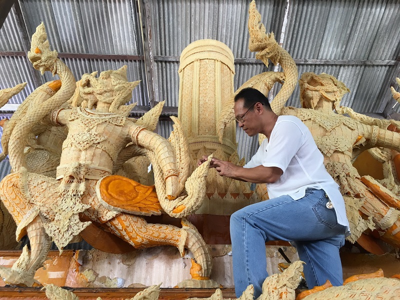 บรรยากาศใกล้วันสำคัญทางศาสนาอาสาฬหบูชาและเข้าพรรษา 16-17 ก.ค.นี้ นอกจากตามร้านสังฆภัณฑ์มีลูกค้าหมุนเวียนมากกว่าปกติ เพื่อเลือกซื้อสินค้าเตรียมไว้ทำบุญแล้ว ในส่วนของการทำต้นเทียนก็มีสีสันไม่แพ้กันตามคุ้มวัดหลายแห่งต่างสรรค์สร้างบรรจงอย่างสุดฝีมือแกะสลักต้นเทียนเกิดความสวยงามที่สุด อย่างที่วัดแจ้ง อ.เมือง จ.อุบลราชธานี ช่างเทียนประดิษฐ์ต้นเทียนติดพิมพ์ขนาดใหญ่ เน้นลวดลายไทยสวยงามอย่างยิ่ง มีทั้งลายประจำยาม ลายกนกเปลว ลายกระจังใบเทศ และอีกหลายลวดลาย เพื่อร่วมขบวนแห่เทียนพรรษาในวันที่ 17 ก.ค.นี้