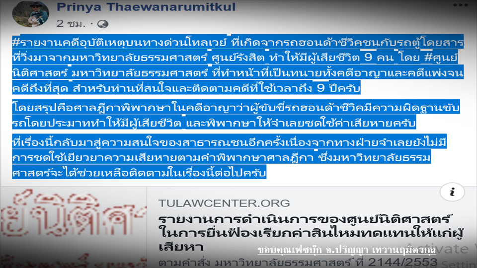 พร้อมกันนี้ยังได้โพสต์แนบรายงานการดำเนินการของศูนย์นิติศาสตร์ในการยื่นฟ้องเรียกค่าสินไหมทดแทนให้แก่ผู้เสียหายในคดีเกี่ยวกับอุบัติเหตุบนทางด่วนโทลล์เวย์ประกอบ ดังนี้